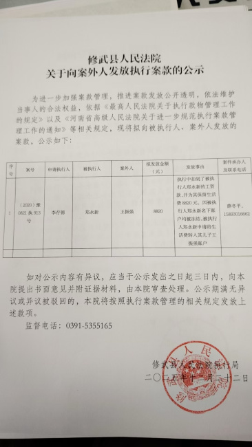 修武县人民法院关于向案外人发放执行案款的公示