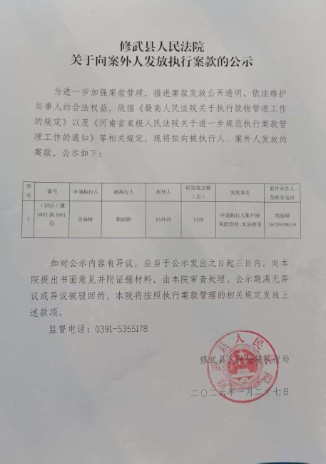 修武县人民法院关于向案外人发放执行案款的公示