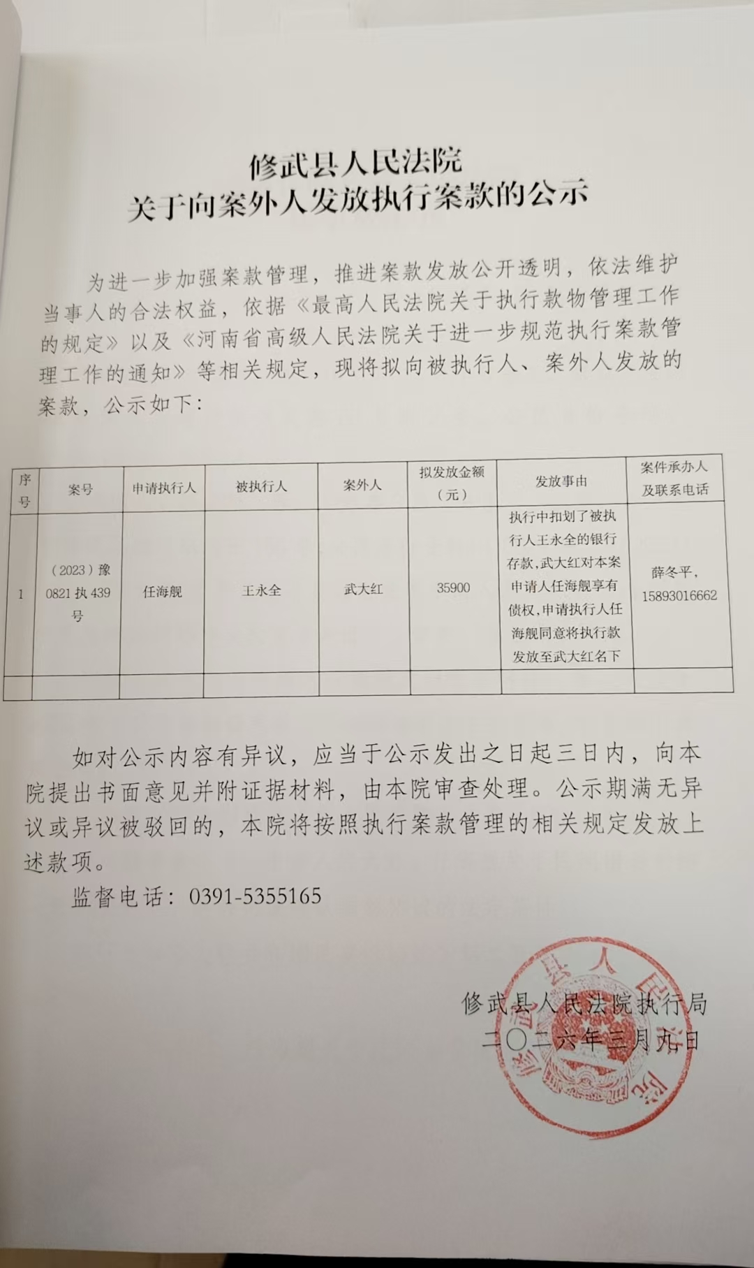 修武县人民法院关于向案外人发放执行案款的公示